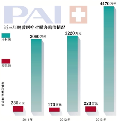 公司招股书显示,2011年、2012年、2013年,鹏爱医疗因客户对服务不满或医疗过失提出索偿而支付的赔偿分别为人民币230万元、170万元、220万元,占相应期间收入的0.8%、0.5%、0.5%,而同期,公司净利润分别为3080万元、3220万元、4470万元。以此计算,2013年,鹏爱医疗用于赔偿的费用约占到净利润的5%。