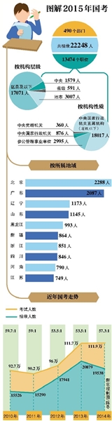 新京报记者统计发现,2015年度国考招录的2.22万人中,区县及以下招17071人,成为本次招录主体。