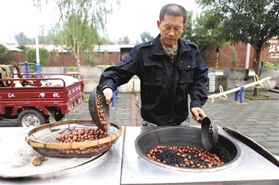 栗花沟六渡河村中的休闲广场上,一名村民在卖新鲜的炒栗子。 新京报记者 秦斌 摄