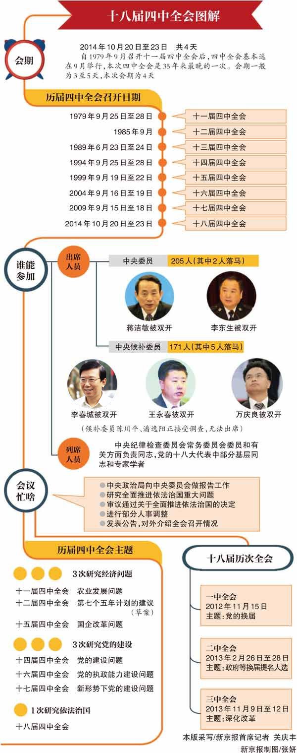 新京报记者梳理以往全会日程发现,全会开幕当天,一般由中央政治局成员向全会作“决定”的说明。据专家分析,人事议题也将是四中全会的焦点。十八大后,2名中央委员、5名候补委员先后落马。