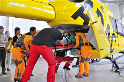 999空中医疗救援组与德国救援人员进行模拟训练,中国首架专业航空医疗救援直升机将于下周二起航。通讯员 李涛 摄