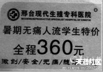 2011年,网友发帖称,私立医院邢台现代生殖专科医院散发“暑期无痛人流学生特价全程360元”的广告。该医院工作人员对羊城晚报的记者承认,暑期是学生怀孕做人流的高峰期,医院为了吸引顾客,在整个八月份进行学生优惠。