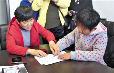 昨日,工作人员帮智障女孩小玲按手印以领补助金。