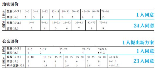 结果显示,25位听证会参加人全部同意调整票价。在同意地铁票价调整的25位参加人中,有1人同意方案一,24人同意方案二。在同意公交价格调整的25位参加人中,有1人同意方案一,23人同意方案二,另有1人提出了新的方案。在25位听证会参加人中,有22位参加人明确表态同意建立动态的调整机制,其余3人没有提出其他意见。