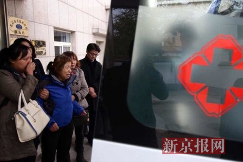 11月7日,北京306医院,于尚清遗孀送丈夫灵柩上车泣不成声。实习生 彭子洋 摄