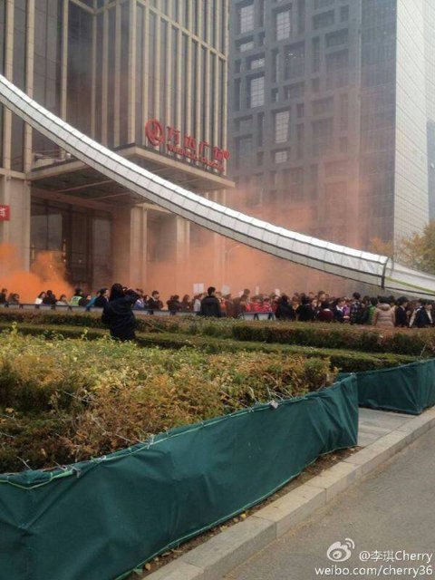 网友“李琪Cherry”也在微博发布了多张照片,确认现场正在演习。照片显示,万达广场主体大楼挂有“北京CBD万达广场2014年度下半年防暴消防实战演练”的横幅,橘红色与白色的消防演习烟雾正向上弥漫,楼下人群聚集,有群众在现场拍照。