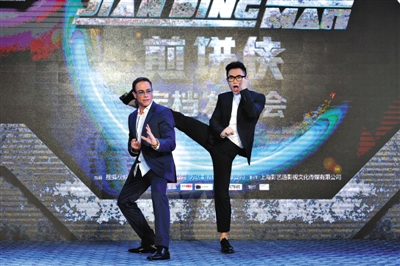 尚格·云顿(左)与大鹏现场耍宝。新京报记者 郭延冰 摄