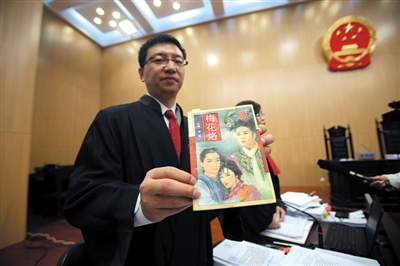 昨日,琼瑶诉于正抄袭案庭审后,琼瑶的委托代理人在法庭上展示琼瑶的《梅花烙》小说。新京报记者 王贵彬 摄