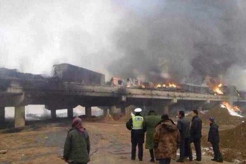 该村民称,早上5点多,她和多名村民赶到现场,看到前后相连的多辆车着火,高速路旁及高速路桥下的树和柴草堆都被引燃,“火势高过当地平房”。村民称,爆炸声持续4个多小时,一直到今天上午8点多。