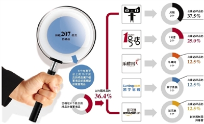 工商总局网监司介绍,“目前已确证8批次样品为假冒商品,占问题样品的36.4%。”涉及售假的知名品牌有新百伦、阿迪达斯、巴宝莉、ZIPPO、雅诗兰黛、伊丽莎白雅顿、金士顿。其中,天猫售假网店最多,达到3个,分别来自天猫上的“迅动运动户外专营店”、“容谷运动专营店”和“玖佰度户外专营店”。而1号店里也查出2个,来自“Amumu专营店”和“仪品雅乐汇专营店”。