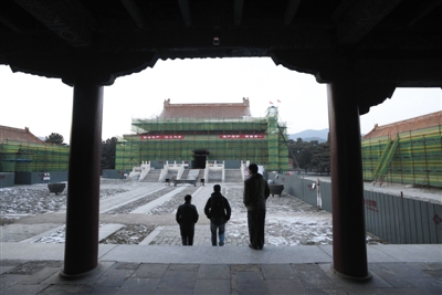 14日,清东陵隆恩殿周围搭起了脚手架。世界文化遗产清东陵启动文物保护工程。