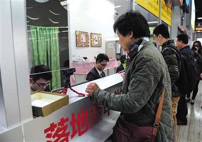 昨日,在金门水头码头“落地签”申办处,三位大陆居民在办理“落地签”。