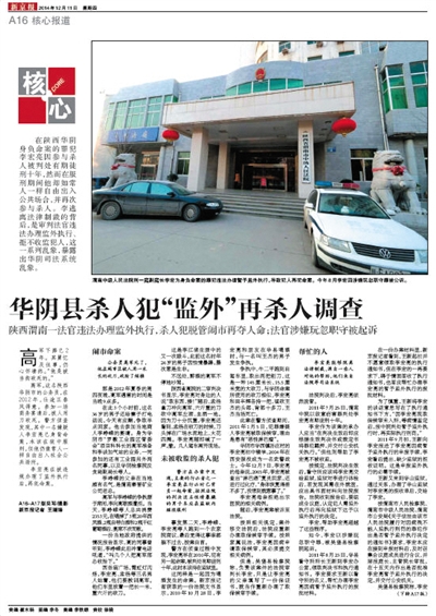 去年12月11日,新京报刊发了《华阴市杀人犯“监外”再杀人调查》,在华阴身负命案的罪犯李宏亮因参与杀人被判处有期徒刑十年,然而在服刑期间,他却如常人一样自由出入公共场合,并再次在闹市组织参与杀死一名公务员(左图)。