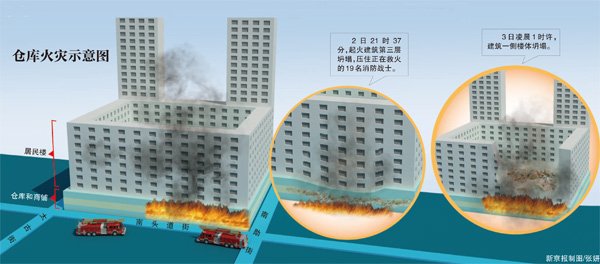 王修信说,一般有易燃材料的仓库要求在梁柱上面做防火材料,还要规定配备各种灭火设备。不过即使在构件上增加了防火材料,在发生大火的情况下,最长也就是支撑两三个小时。如果是框架结构,钢筋被大火烧得软化后,梁柱就慢慢瘫下来了。