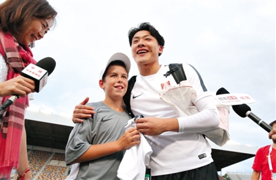昨日国足训练开始前,亚足联特地安排小球童斯蒂芬·怀特——这名布里斯班12岁的小男孩与王大雷一道接受媒体的采访。当记者问及为什么对王大雷说那番话时,面对黑压压的媒体,小怀特紧张地说,“因为我也是一名门将,我觉得前锋都习惯往左边射,所以我就说了左边。”