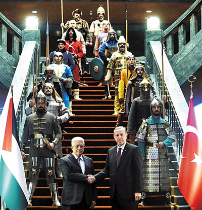 土耳其总统埃尔多安12日在总统官邸会晤到访的巴勒斯坦领导人阿巴斯。据英国媒体报道一组官方发布的欢迎仪式图片在社交媒体上引发热议。这组图片显示,两位领导人在楼梯前握手并合影,让人不得不注意到的是,在楼梯上站着的16名戴着华丽的头盔、穿着盔甲、手拿长矛与剑的士兵。土耳其总统府消息人士称,每个士兵代表了土耳其的一个历史时期,他们表示,这些士兵将在未来的欢迎仪式中起到重要作用。(宗和)