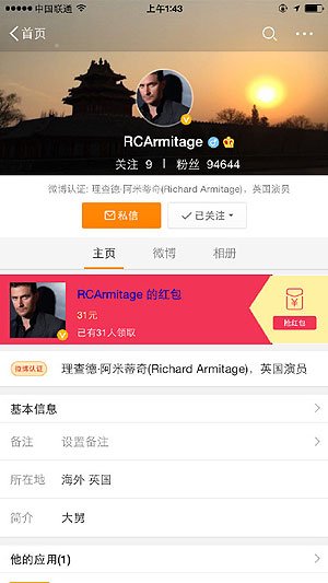 彩蛋来了!故事是这样的,电影《霍比特人3》中的英国演员Richard Armitage开微博后,用度娘直译了自己的名字,把微博简介改为“李建军”,几天后,他又不知为何把简介改成了“大舅”,网友们笑中带泪,“这也太亲民了吧”。“英国演员•李建军”,一位段子界的种子选手,我们看好你哦。