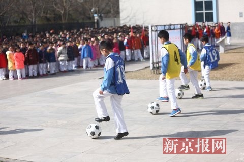 北京小学足球队员在展示球技。新京报记者 浦峰 摄