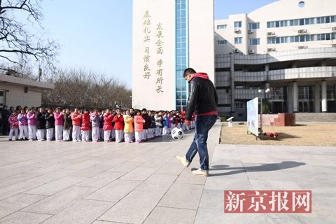 新京报快讯(记者黄颖 实习生刘思维)“同学们快转身,问学长好!”随着老师的一声提醒,在北京小学的操场上整齐列队的小学生们齐刷刷向后看,向北京国安足球俱乐部副董事长、资深足球节目评论员张路喊出“学长好!”