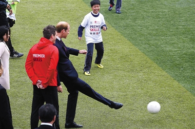 3月3日,威廉王子在上海南洋中学参加学校举行的“学转英超”青少年足球普及项目展示庆典,并亲自示范踢球动作。