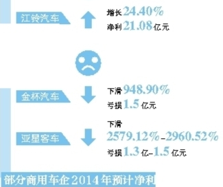亚星客车也发布公告预计2014年度经营业绩将出现亏损,实现归属于上市公司股东的净利润将亏损1.3亿-1.5亿元,同比下滑2579.12%-2960.52%(2013年归属于上市公司股东的净利润为524.38万元)。亚星客车认为,业绩预亏的主要原因之一是2014年国内外经济增长乏力,经济增速持续下滑,公司面临市场、成本与价格、节能排放等多方面的压力,公司搬入新厂区后刚性费用增加,人工成本上升,导致主营业务利润亏损较大。