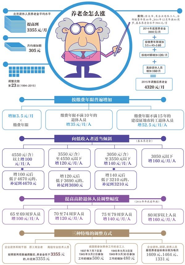 此次调整将从2015年1月1日起执行,1、2月增加的养老金将随3月份养老金同时补发到位。据悉,这次调整将惠及全市228万企业退休人员。