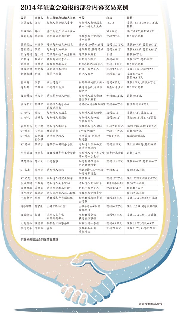 据新京报记者统计,2014年,证监会发布了几十份针对内幕交易的行政处罚书,超过60多人受到罚款等处罚。