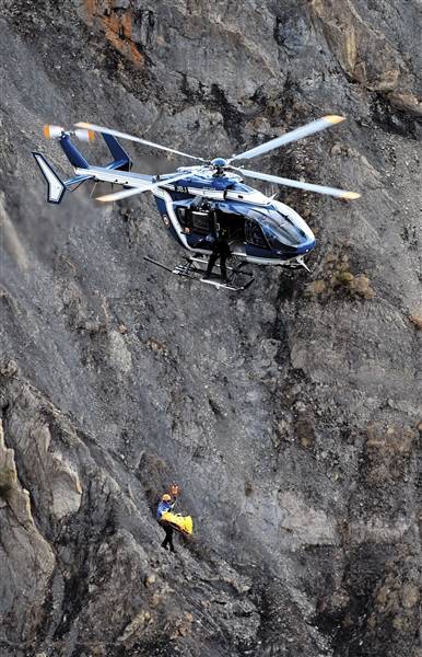26日,法国搜救人员正在用直升机转移遇难者遗体。