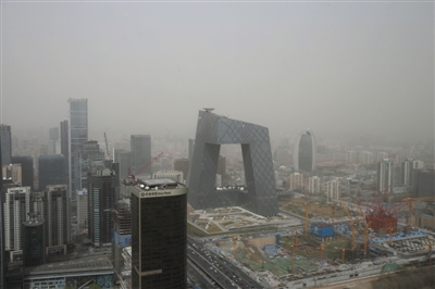 3月28日,北京遭遇今年首个沙尘天气,东三环周边建筑被黄色沙尘笼罩。新京报记者 王贵彬 摄
