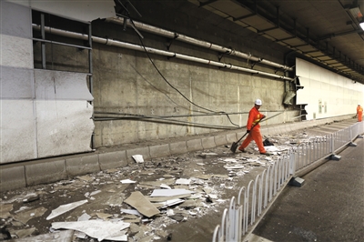大屯路隧道内,北侧约70平米墙皮被剐蹭掉,救援人员正在清理。新京报记者 浦峰 摄
