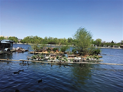 昨日下午,因前晚9级大风被吹跑的野鸭岛,已拖回原处,岛上的野鸭蛋完好无损。 新京报记者 程媛媛 摄