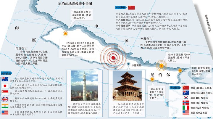 4名中国公民在尼遇难,尼军方称遇难人数可能接近5000人;加德满都谷地九成老建筑坍塌