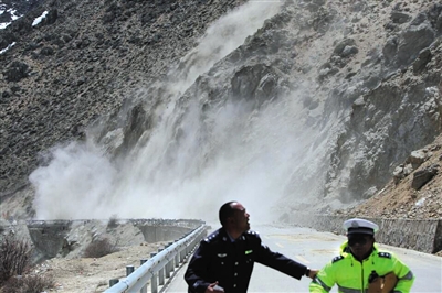 26日15时许,正在距离西藏日喀则市聂拉木县5公里执行任务的两位民警险些被余震震落的滚石击中。图/IC