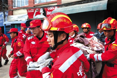26日,尼泊尔首都加德满都,中国国际救援队搜救队员从坍塌的楼房中抬出一名幸存者。 新华社记者 白阳 摄