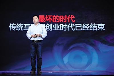 4月28日,北京国家会议中心,阿里移动事业群总裁俞永福在全球移动互联网大会上表示,要对“非互联网”有敬畏之心。图/CFP