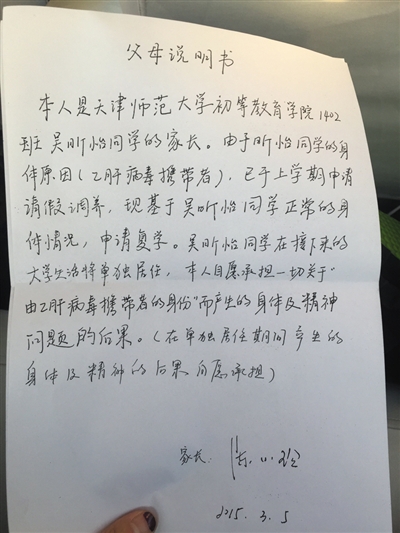 4月20日,这份抬头是“父母说明书”的复印件中显示,“吴昕怡同学在接下来的大学生活将单独居住,本人自愿承担一切关于‘由乙肝病毒携带者的身份’而产生的身体及精神问题的后果。”说明书的末尾用括弧补充,“在单独居住期间产生的身体及精神的后果自愿承担”。