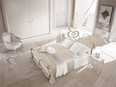 这个白色的卧室空间,因为这张床的曲线而变得柔美起来。是不是有一个穿着白色芭蕾舞裙的美丽女子,在这里翩翩起舞,于是成就了这张床的优美线条。于是,这个空间里不再需要多余的装饰,以这张床为中心,白色的衣柜、浅灰色的单人复古沙发、白色床头柜,还有窗边那被风微微吹起的纱帘,都成为床的“点缀”。当然,金属的台灯、柜门上的曲线都在和这张床一起“舞蹈”,制造出属于这个空间的独特气质。