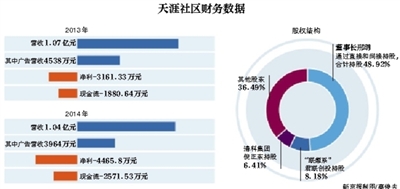 《说明书》显示,广告和增值业务是天涯社区的两大主要收入,二者比例大约为4:6。2014年,天涯的广告营销收入为3964万元,相比2013年的4538万元,下降12%。