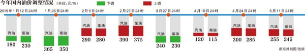 截至目前,2015年我国油价共经历9轮调价周期,其中三次下调,五次上调,另有一次因幅度不足50元/吨而暂不调整。汽油累计上调570元/吨,柴油上调490元/吨,折合零售汽油每升上调0.43元,柴油每升上调0.41元。