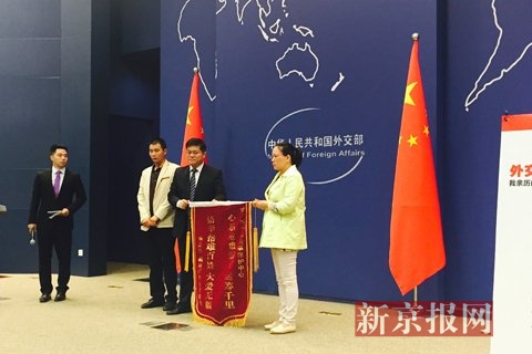 5月12日上午,得到领事协助的朱姓夫妇向外交部领事保护中心赠送锦旗。新京报记者 高美 摄
