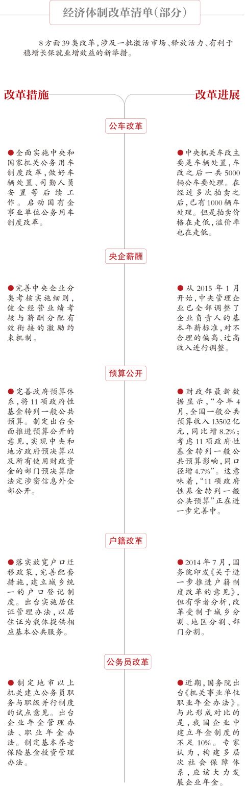 新京报讯 昨天,《关于2015年深化经济体制改革重点工作意见》公布,列出今年深化经济体制改革9方面39条重点“清单”。其中,简政放权居于首位,中央和国家机关车改今年全面实施,并启动国有企事业单位公车改革。今年还将出台深化出租汽车行业改革指导意见。