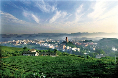 遵义市地域广阔,15个县(区、市)形成了四个特色鲜明的产业集群,位于东部的湄、凤、余三县都是产茶大县,且各有特色。湄潭县是贵州茶叶第一县、贵州省最大的茶叶基地,被誉为“中国名茶之乡”,代表茶叶是“湄潭翠芽”。凤冈县有“全国唯一锌硒同具茶叶产地”的头衔,凤冈锌硒茶全国驰名。余庆县被誉为“小叶苦丁茶之乡”,其盛产的小叶苦丁同样也是海内知名。