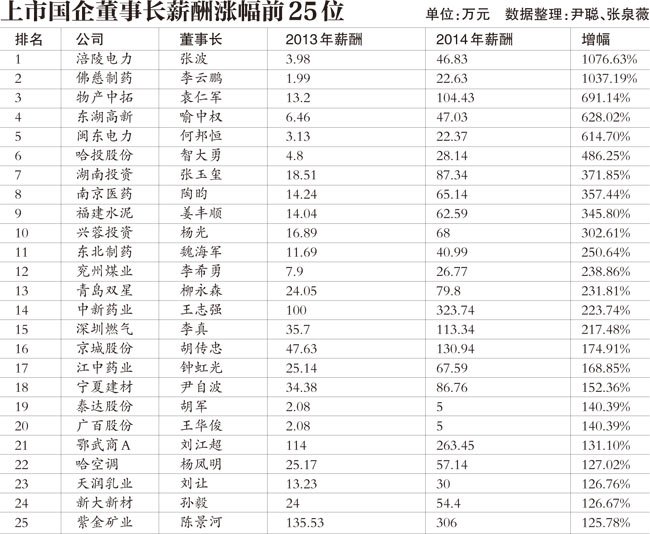 除去前一年年薪“基数过低”的,仍有21位董事长年薪涨幅超100%;部分上市国企业绩下滑仍给董事长涨薪