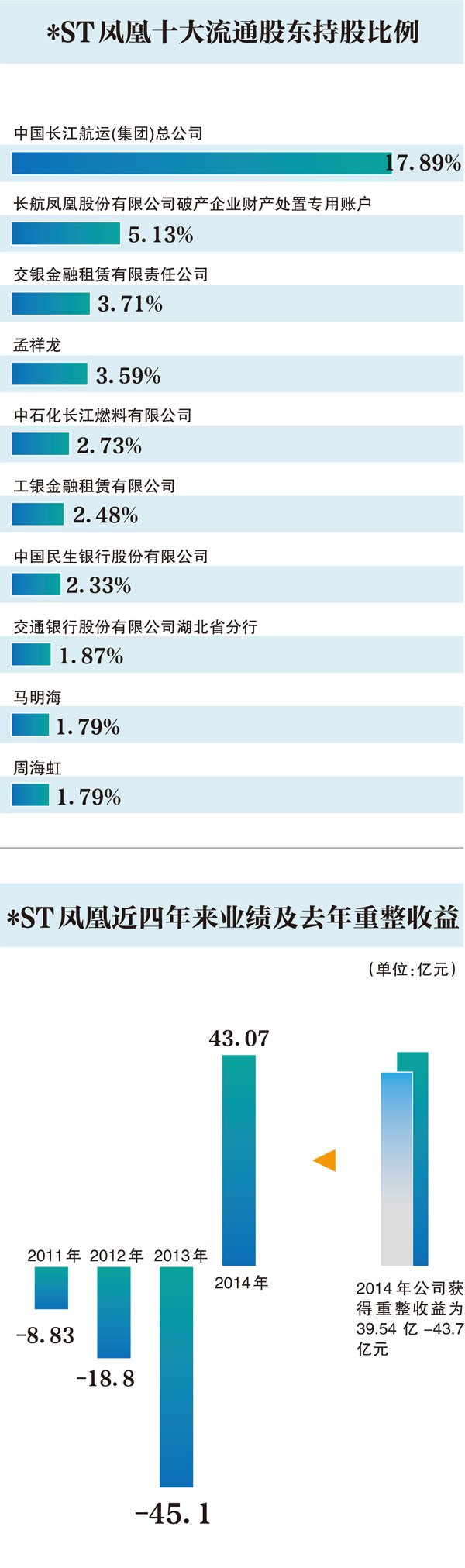 *ST凤凰的业绩数据显示,2014年,公司实现营业收入9.82亿元,同比减少27.49%;净利润为43.07亿元,同比增加195.41%。根据这一业绩表现,之前连续三年亏损而于2014年被暂停上市的*ST凤凰,获得了恢复上市的基本资格。在公司进行破产重整之后,长航集团的持股比例被稀释至17.89%,目前仍为上市公司大股东和实际控制人。
