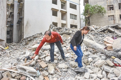 昨日,骆开素夫妇在废墟上试图找回家中的一些财物。楼房垮塌事发前半小时,骆开素夫妇及时发现险情,挨家挨户叫醒了全楼的人,最终楼内67人安全撤离。 新华社记者 刘续 摄