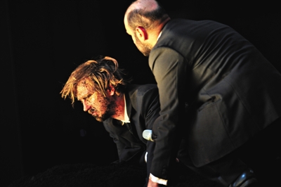 托马斯·奥斯特玛雅,这个德国当代戏剧的风云人物,一度被中国业界戏称为“德国孟京辉”。他是邵宾纳剧院的艺术总监,也是此次《哈姆雷特》的导演。在看过了各种角度解读的《哈姆雷特》之后,你不得不承认,奥斯特玛雅此版的确是一次极富魅力的改编。从开场老国王的下葬,土刚埋上,原地就成了王后与克劳狄斯的婚礼现场。舞台布景主要是真实的泥土和金属色的珠帘,据导演说灵感来自艺术家达明·赫斯特著名的“钻石骷髅”,浮华与死亡的强烈对比;泥土则隐喻了哈姆雷特复仇也是一场自掘坟墓的行为。