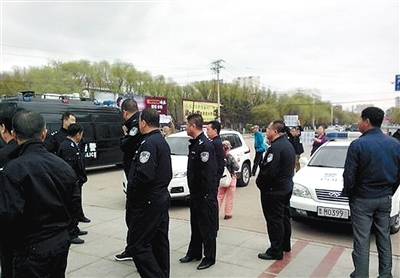 6月15日9时许,山东省潍坊市中院门口突然聚集20多人,他们打出“人民有权监督司法”、“徐某某无罪”等横幅标语,向围观群众喊冤。