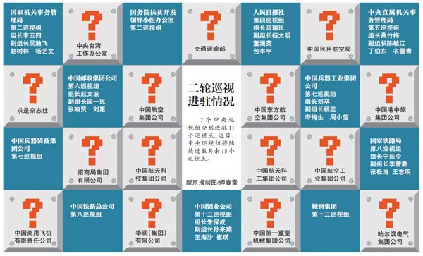 至昨晚,7个中央巡视组分别进驻了11个巡视点:中央直属机关事务管理局、国家机关事务管理局、国家铁路局、国务院扶贫开发领导小组办公室、人民日报社、中国兵器工业集团公司、中国兵器装备集团公司、鞍钢集团公司、中国铝业公司、中国邮政集团公司、中国铁路总公司。