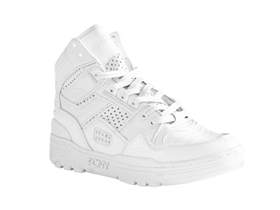 DKNY和PONY合作推出一款灵感来自纽约、男女皆宜的限量版运动鞋,以PONY经典的M100高帮运动鞋为原型,采用清新的全白色设计,以轻盈透气的打孔真皮、压花蛇皮和运动时尚的真皮鞋带稍加点缀,DKNY和PONY的品牌标志印制在两侧以及后侧。