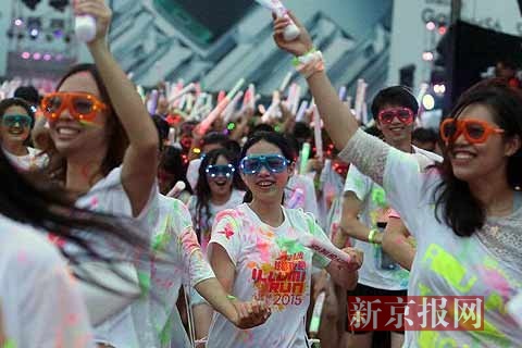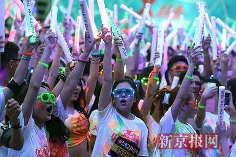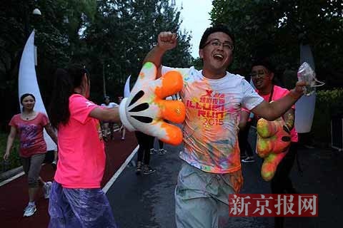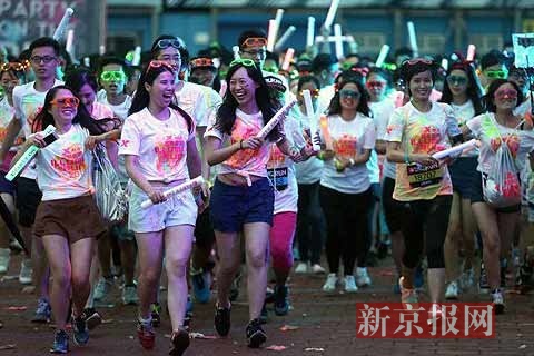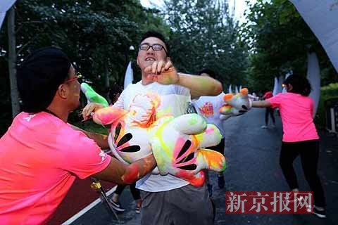 新京报快讯(记者 薛珺)7月18日晚,朝阳公园,八千余名跑步爱好者参加了全程5公里的ILLUMI RUN荧光炫彩夜跑。每隔一公里,工作人员会用沾满荧光颜料的手套印在参跑者的身上,用这种特殊的方式为他们加油。